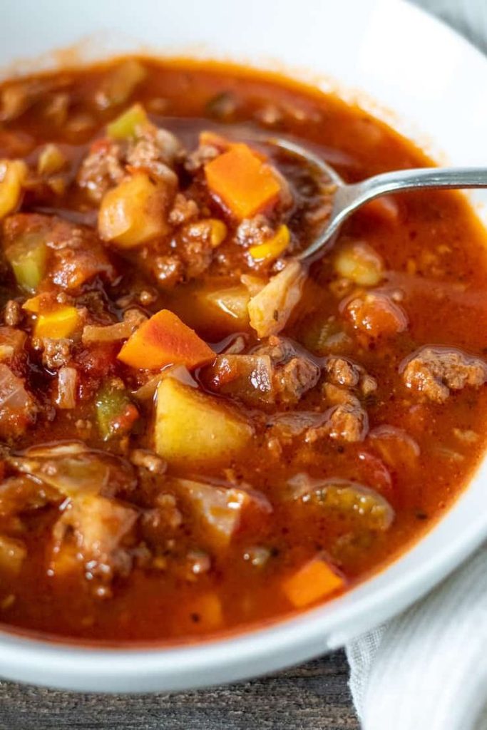 You get hearty protein from ground beef, loads of vegetables, and a broth that feels comforting without feeling heavy.