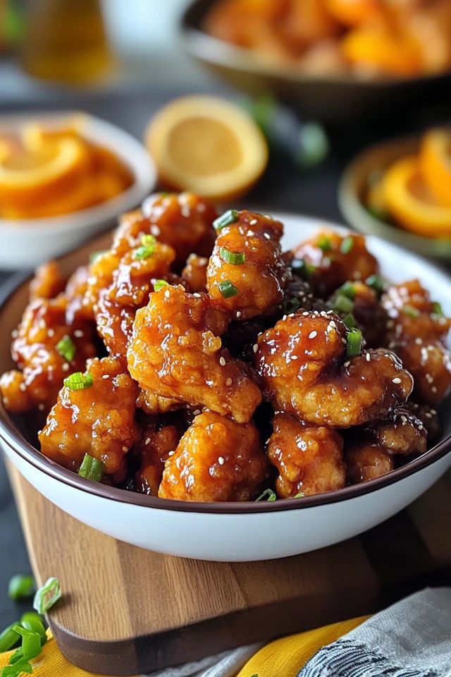 Add the fried chicken to a large pan or bowl. Pour the hot orange sauce over it and gently toss until every piece is coated.